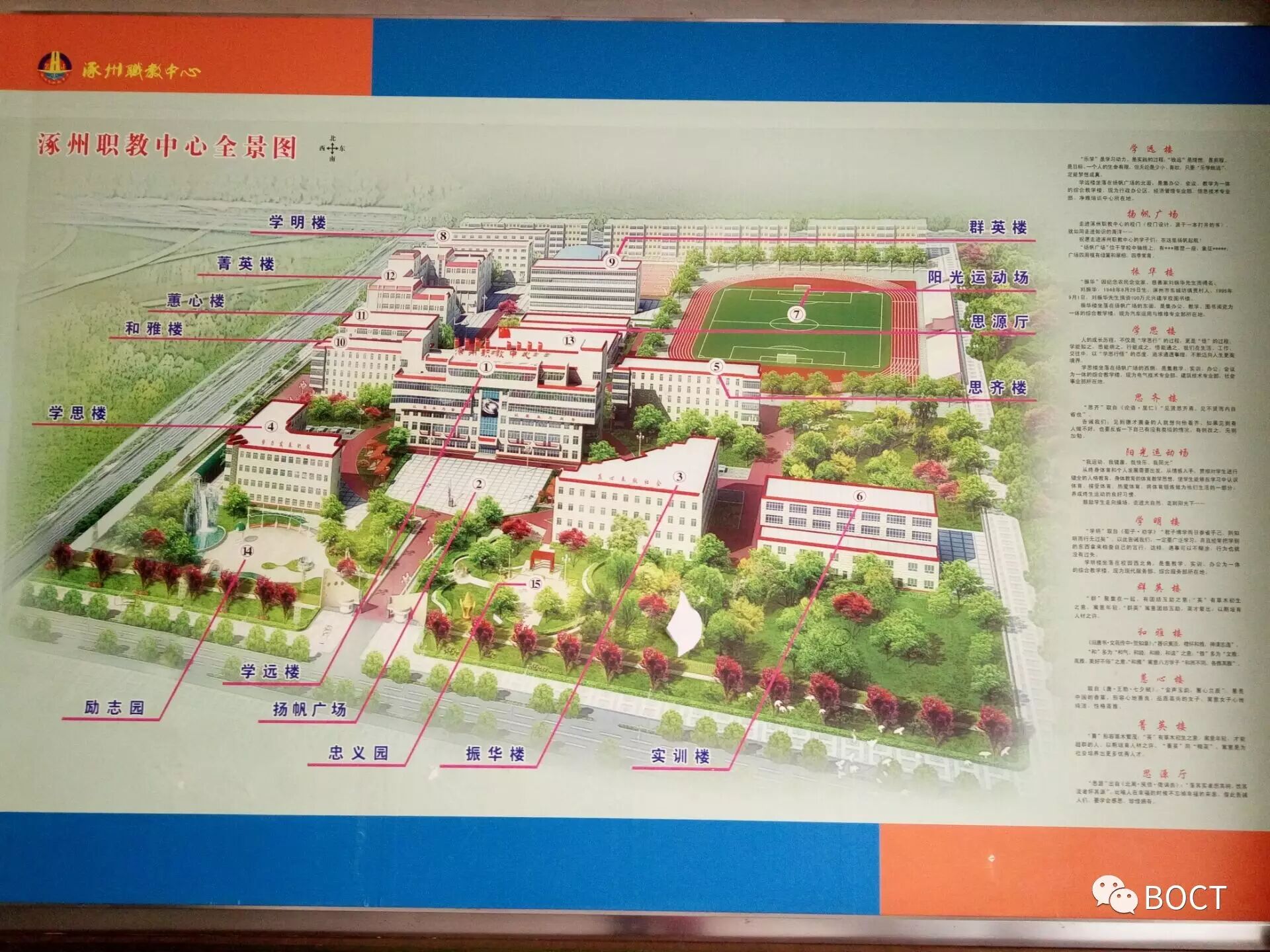 涿州职教中心是国家首批中等职业教育改革发展示范校,学校占地面积238亩,有教学楼、公寓楼、游泳馆等主要建筑16栋,并建有高标准的塑胶操场,建筑面积12万平方米。现有170个教学班,在校生9000余人。目前所有教室都已配备多媒体教学和监控系统,其高度信息化的系统配备深受学生家长和教育管理者的盛赞。