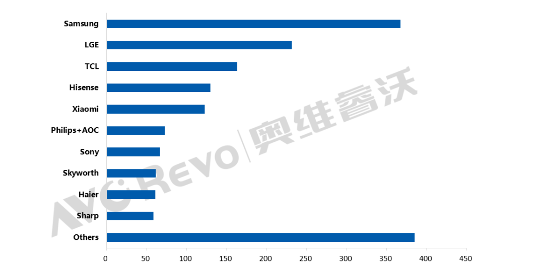 Samsung 1月共出货367万台,同比增长7.9%,除亚太出货同比微降0.5%外,其他区域出货均有增长,其中北美、欧洲、拉美、中东非分别增长20.8%、4.4%、4.1%、13.6%。在产品结构方面,三星55寸及以上出货占比43.6%,较去年同期增长6%。