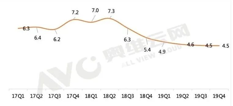 一方面上游价格下降,品牌增多,市场竞争激烈;另一方面,渠道下沉,低端市场扩张,县乡级市场对价格敏感,加速了小间距LED价格的下滑。19Q4小间距LED市场均价4.5万/平米,同比下降16.0%。
