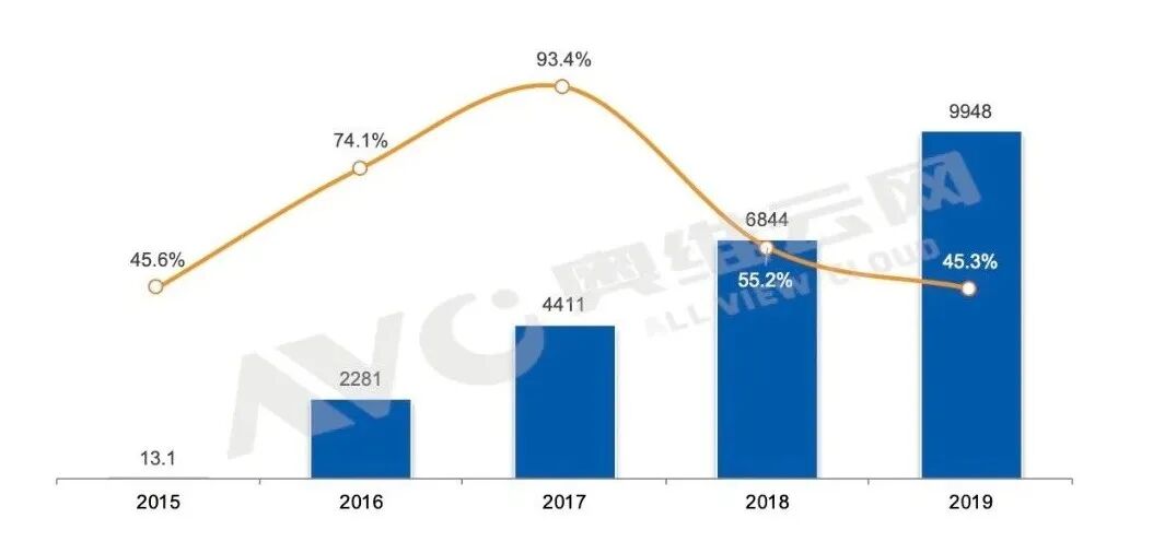 小间距LED高刷高亮、画质逼真、寿命长、无拼缝的优势,能够满足多种场合的应用。在其强大的攻势下,大量投影、DLP拼墙、液晶显示代理商、渠道商纷纷转战布局小间距LED产品。奥维云网(AVC)《2019年中国大陆小间距LED市场研究报告》显示:2019年,中国小间距市场销额9948M元,同比增长45.3%,销售面积为215.8 K平方米,同比增长97.4%。