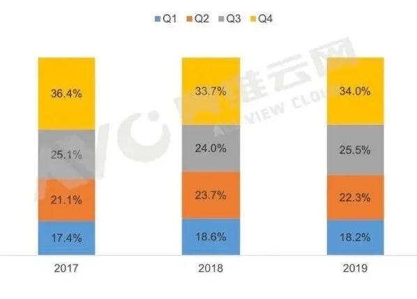 2017-2019年中国小间距LED市场销额分季度占比情况