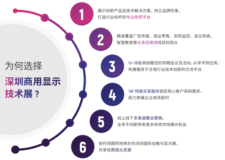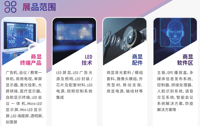 深圳商用显示技术展(COMMERCIAL DISPLAY)面向高附加值应用行业,本届展会集中展示各类商显终端产品、商显配件、商显软件及各类商显应用场景。依托超50万行业优质买家数据,2021年展会预计将吸引海内外150家参展商及品牌,面对来自广告传媒、商业零售、展览展示、安防监控、会议系统、场馆建设、智慧教育、市政工程、商业地产等行业的10,000名采购决策人和数以万计来自展会第二空间的在线专业观众展示创新产品及技术解决方案。